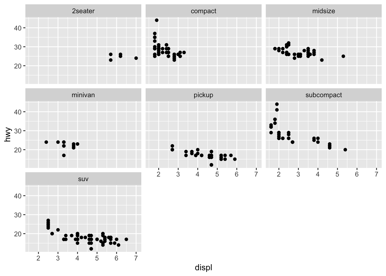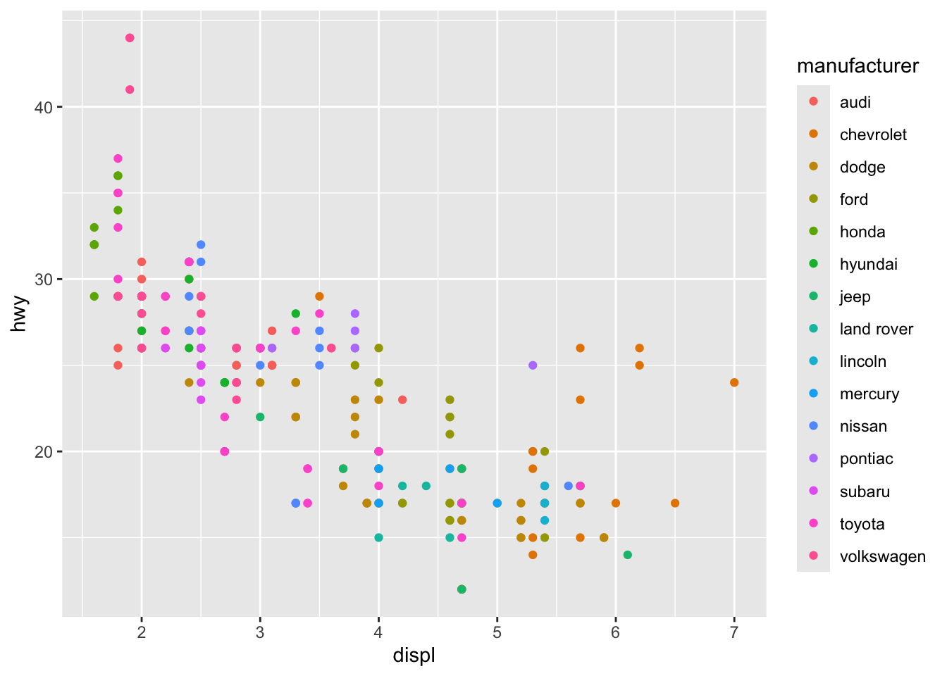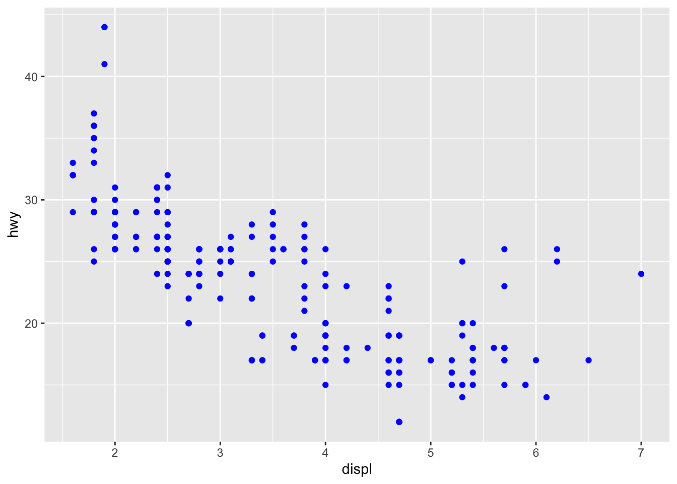 ggplot(mpg, aes(displ, hwy)) +
