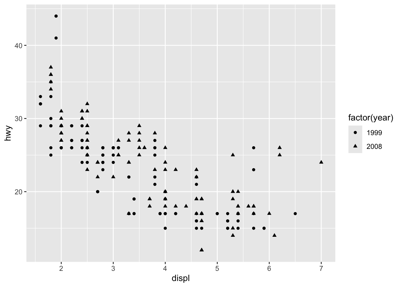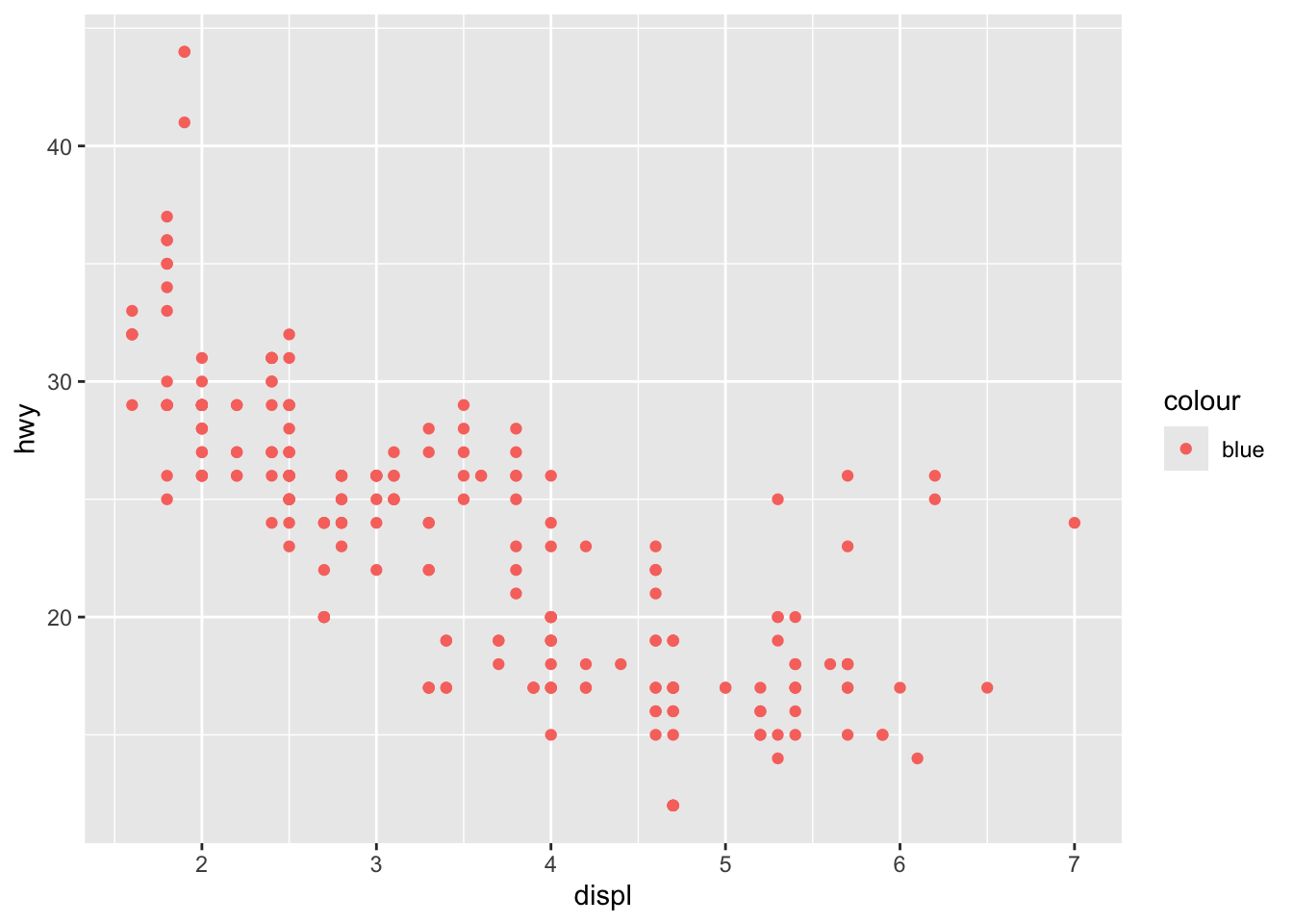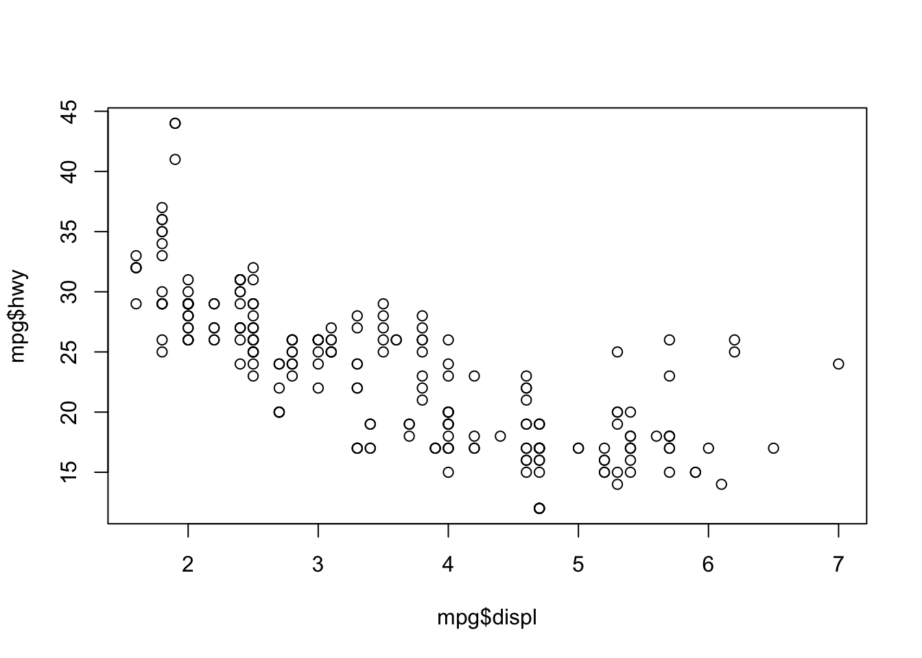 ggplot(mpg, aes(displ, hwy)) +