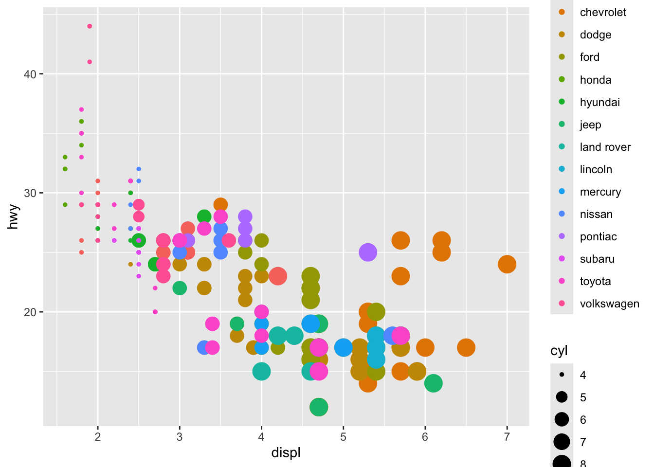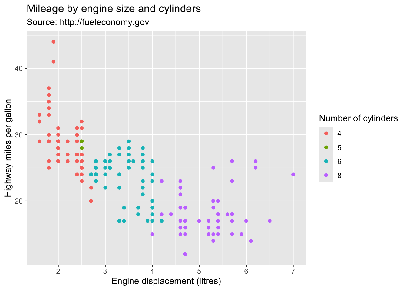 title = "Mileage by engine size and cylinders",