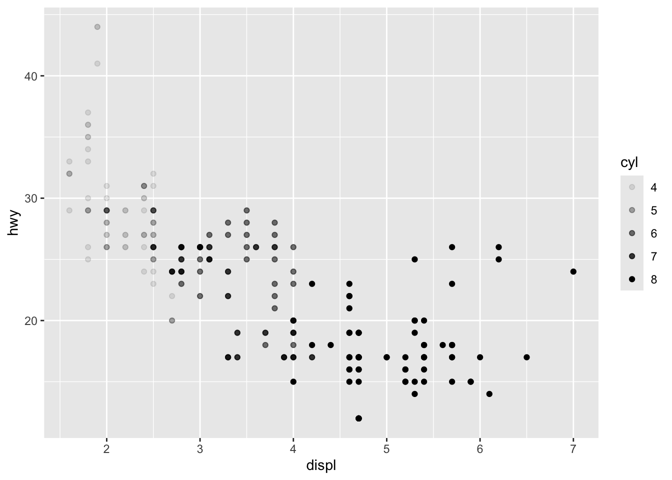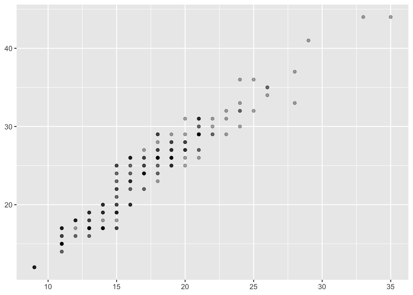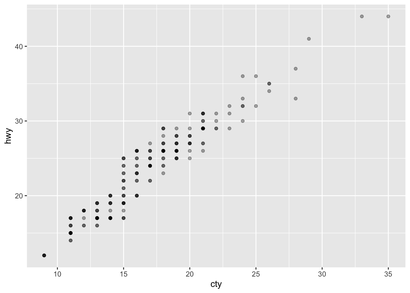 ggplot(mpg, aes(cty, hwy)) + geom_point(alpha = 1/3)