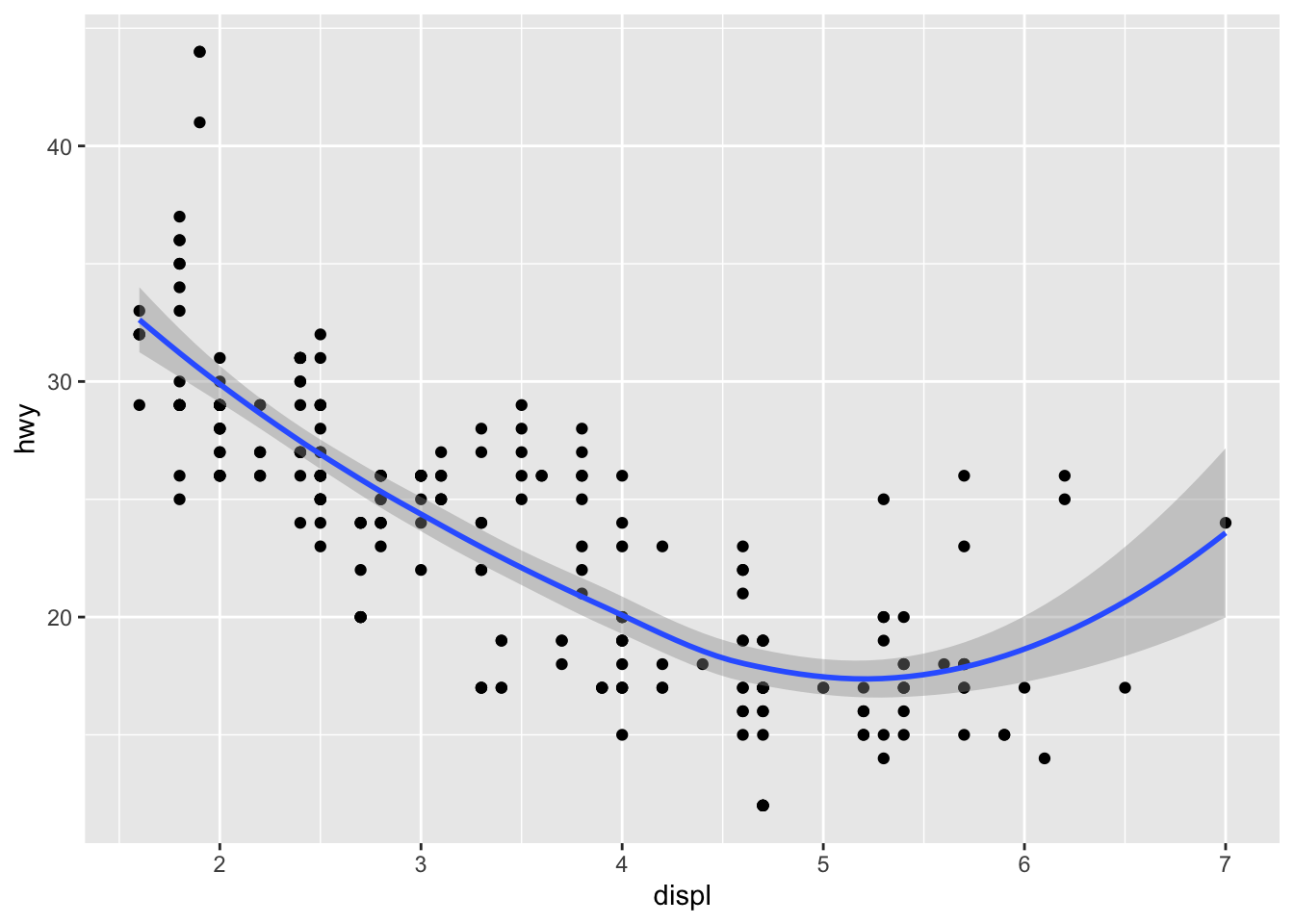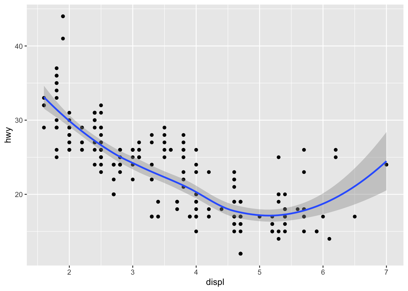 ggplot(mpg, aes(displ, hwy)) + geom_point() + geom_smooth()