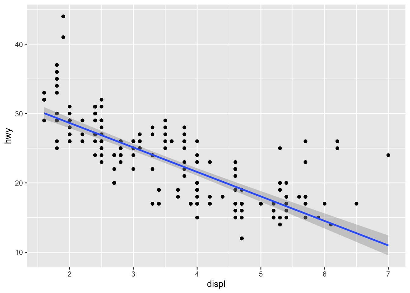 ggplot(mpg, aes(displ, hwy)) + geom_point() + geom_smooth(method = "lm")