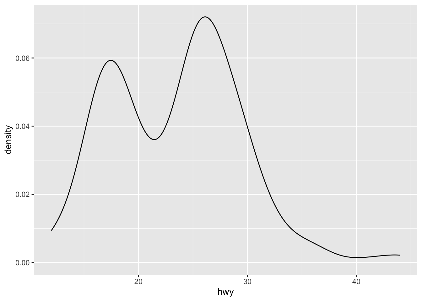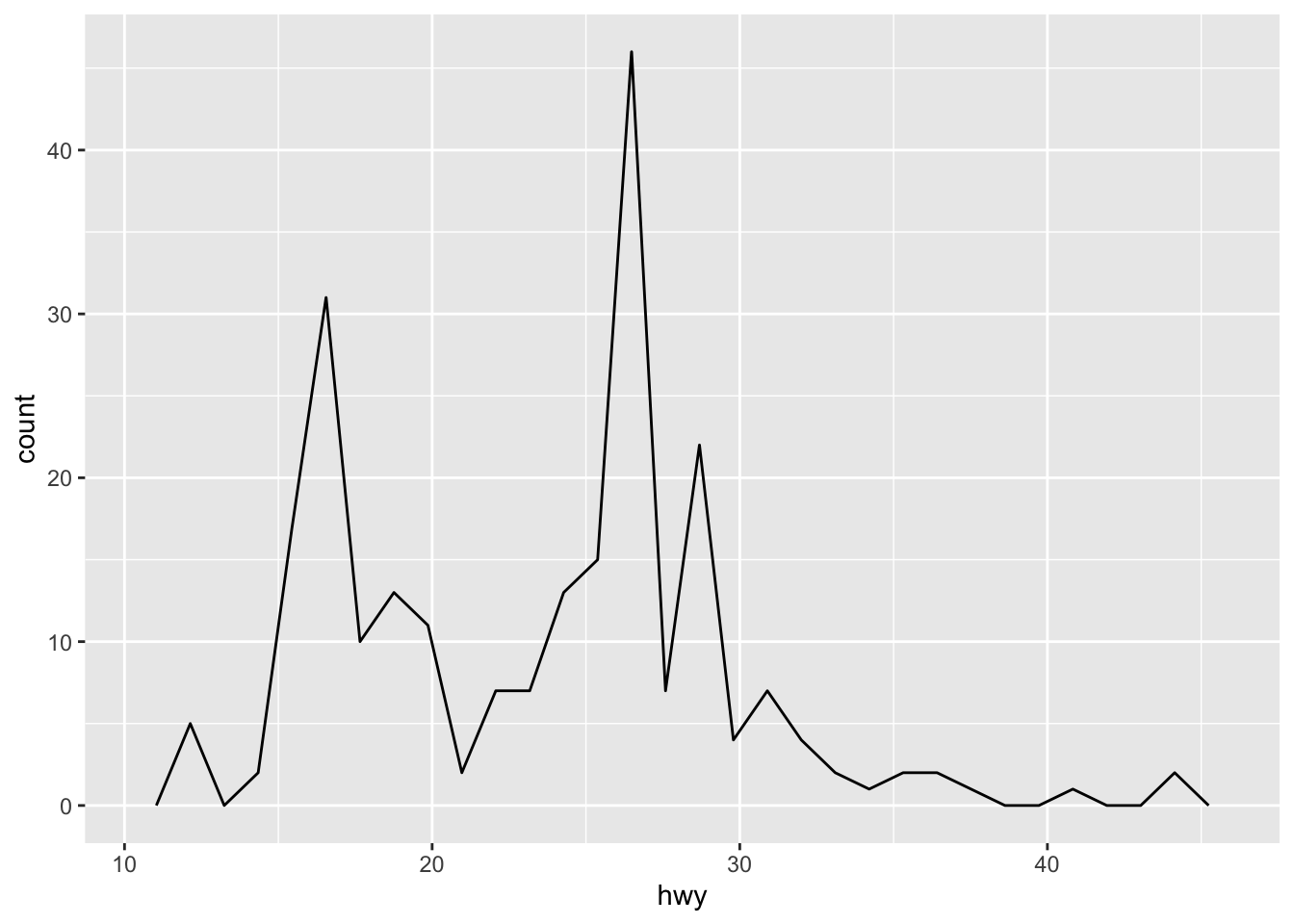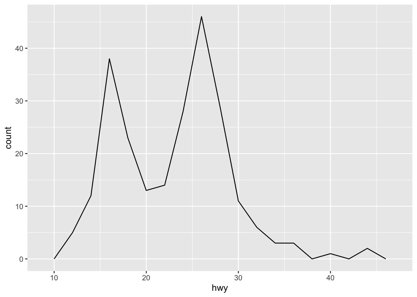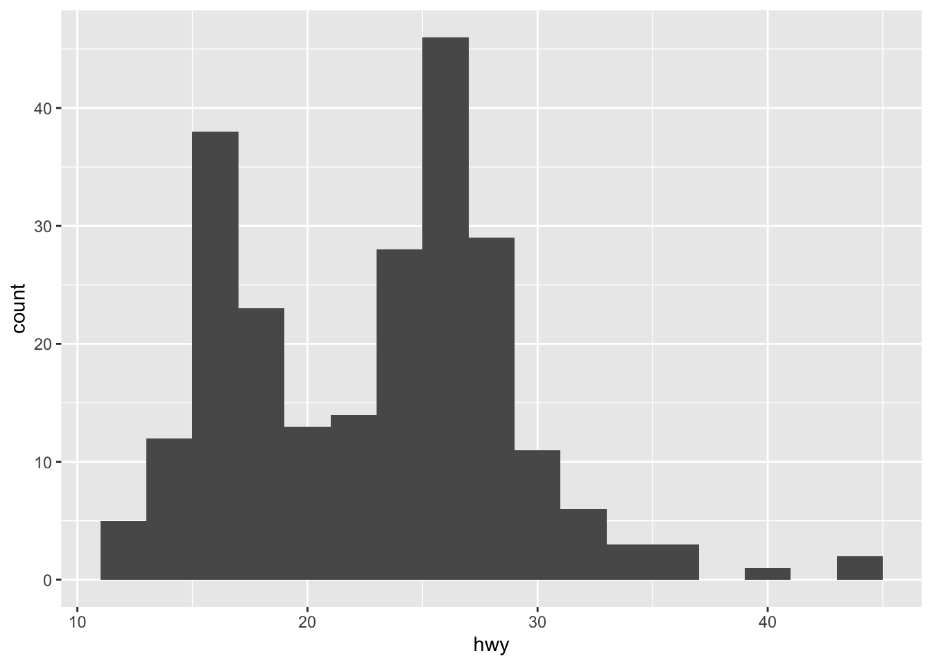 p <- ggplot(mpg, aes(hwy)) +