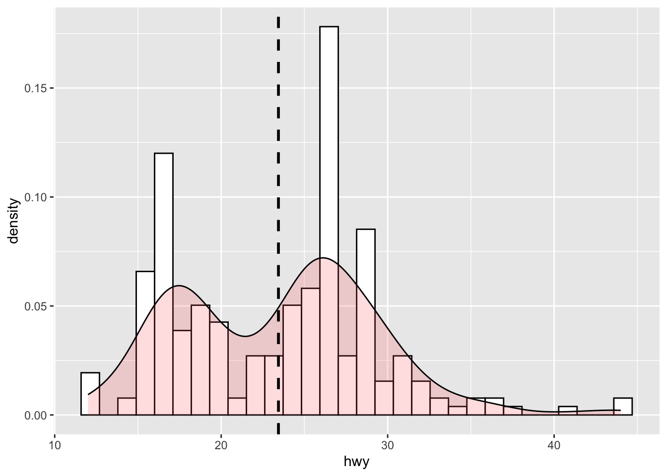p + geom_vline(aes(xintercept = mean(hwy)), linetype = "dashed", size = 1)`stat_bin()` using `bins = 30`. Pick better value with `binwidth`.