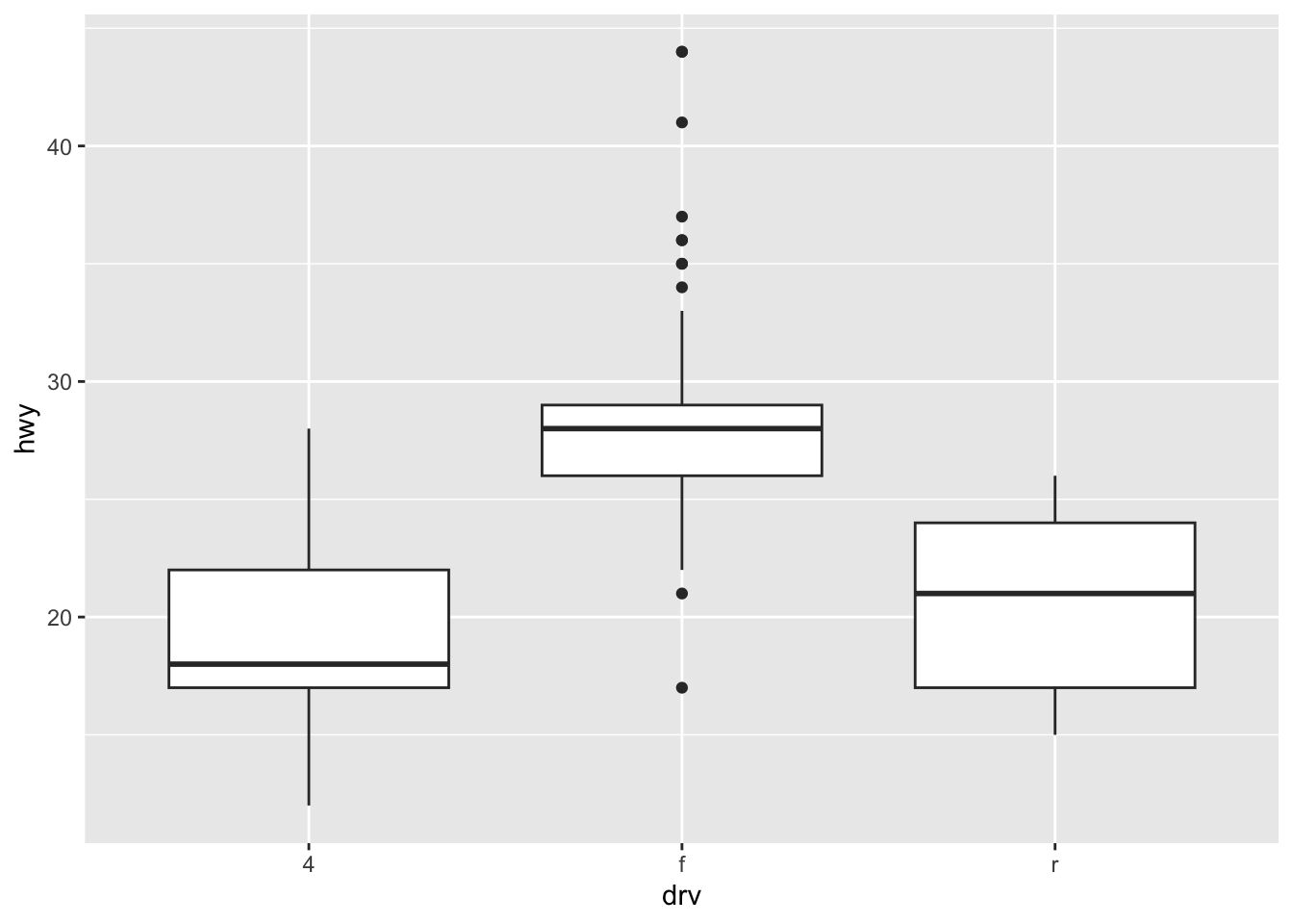 ggplot(mpg, aes(drv, hwy)) +