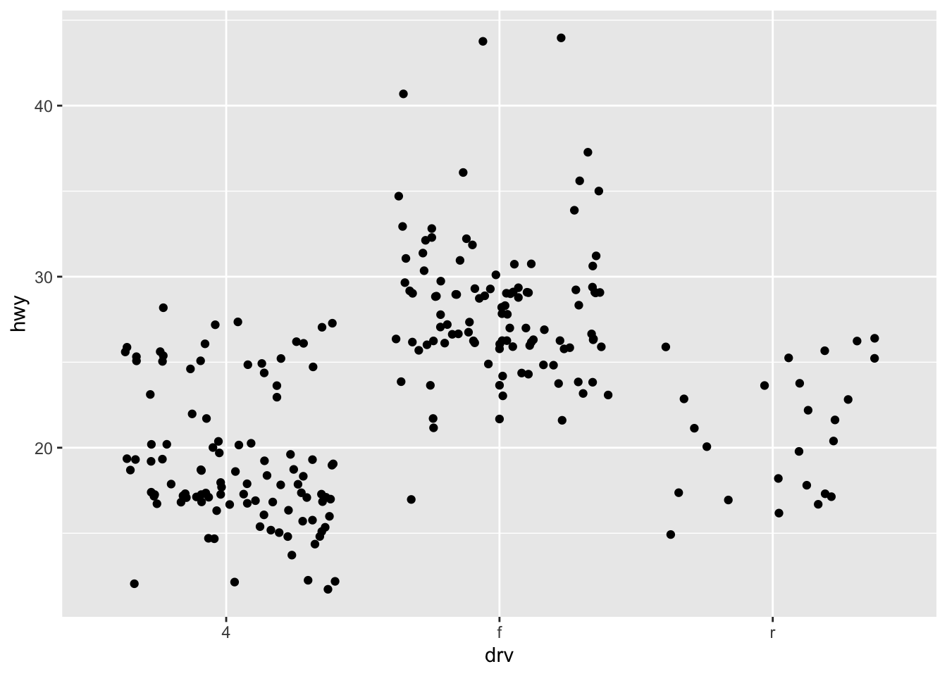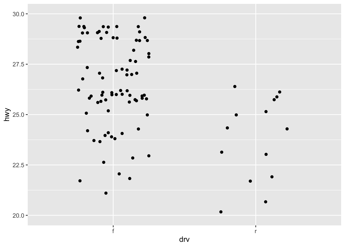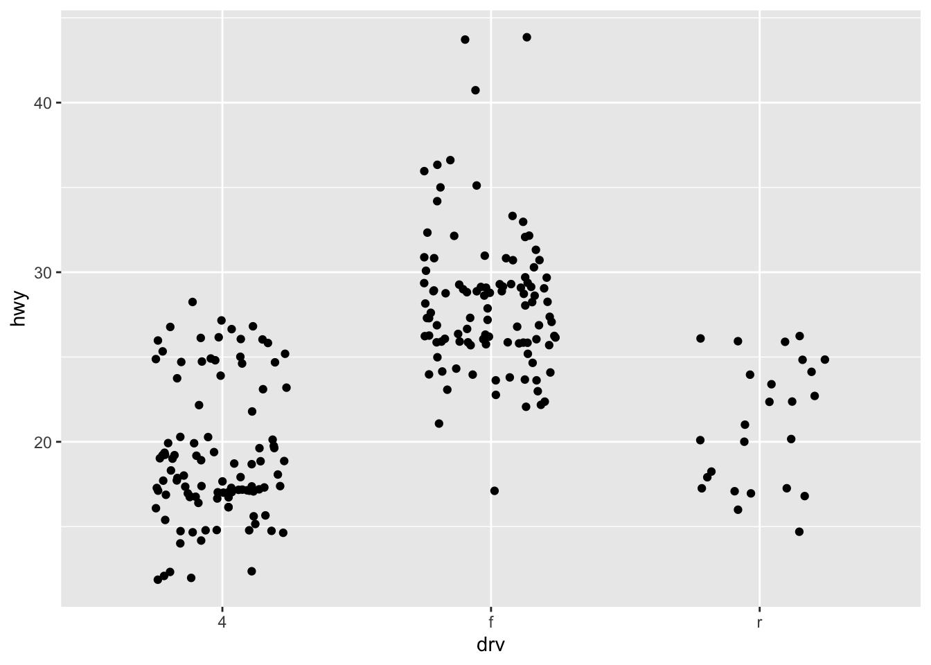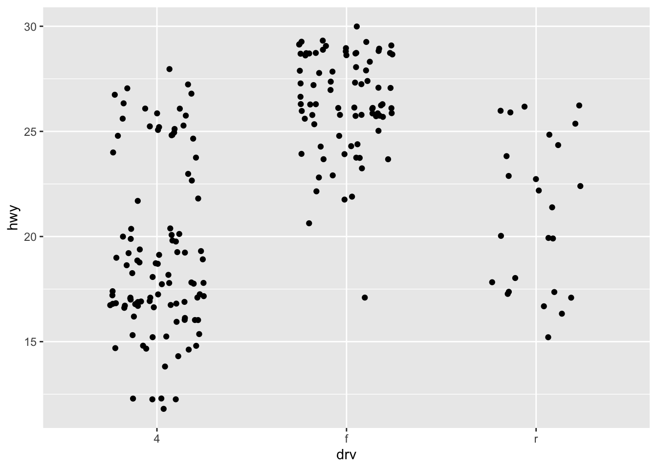 ggplot(mpg, aes(drv, hwy)) + geom_jitter(width = 0.25)