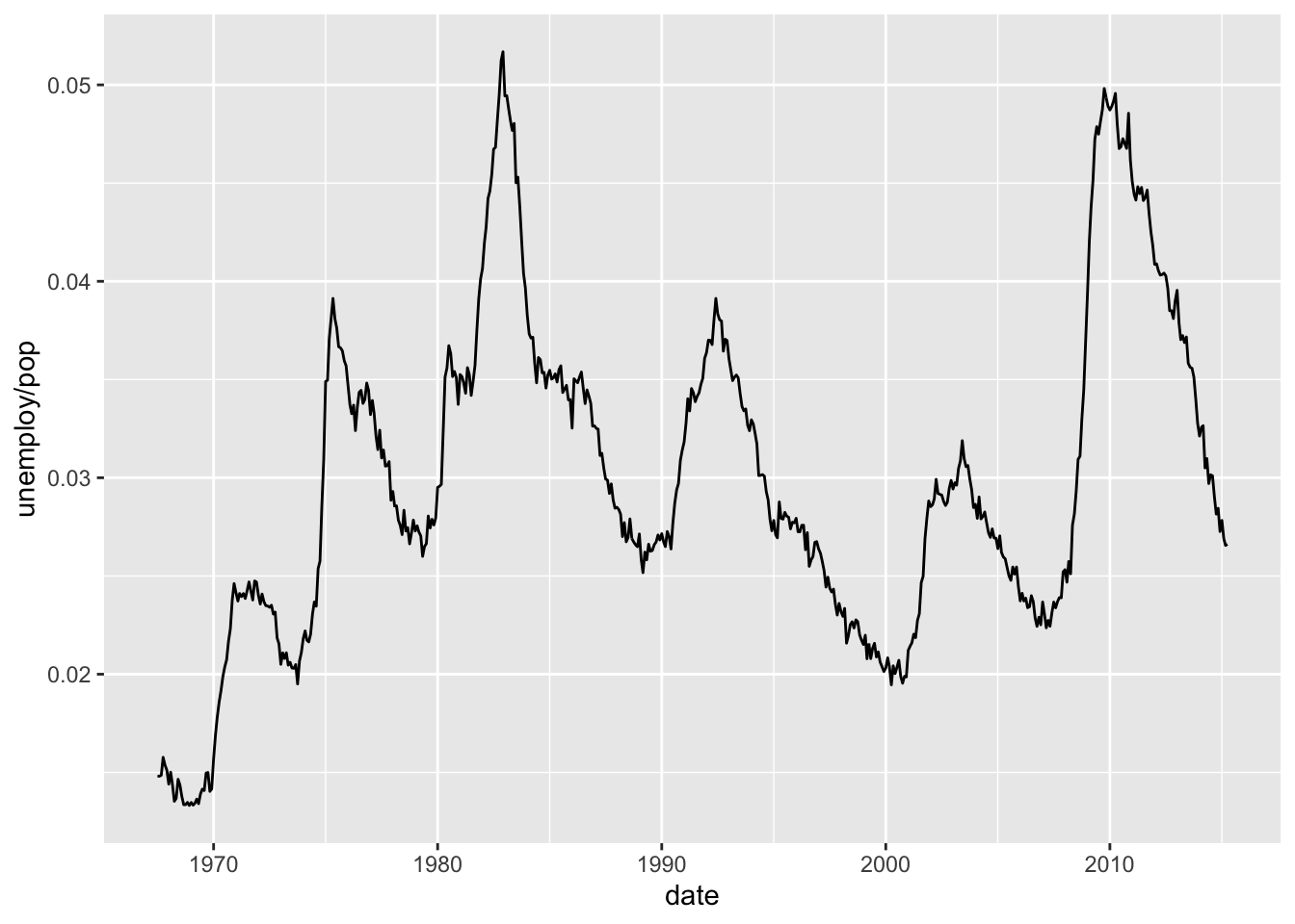 ggplot(economics, aes(date, unemploy / pop)) + geom_line()