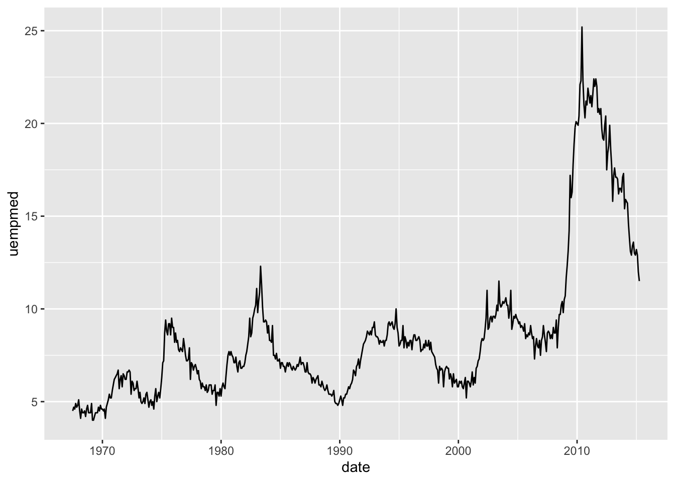 ggplot(economics, aes(date, uempmed)) + geom_line()